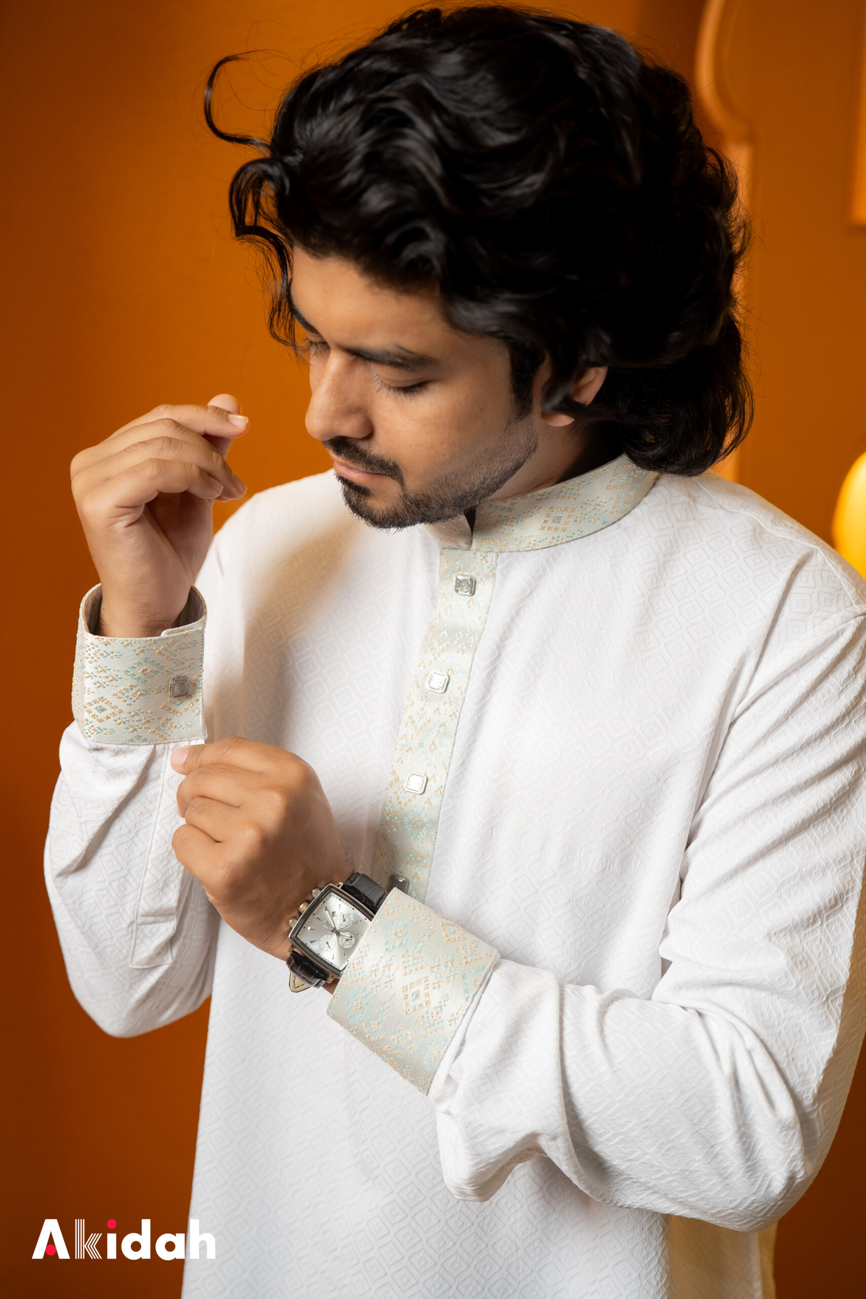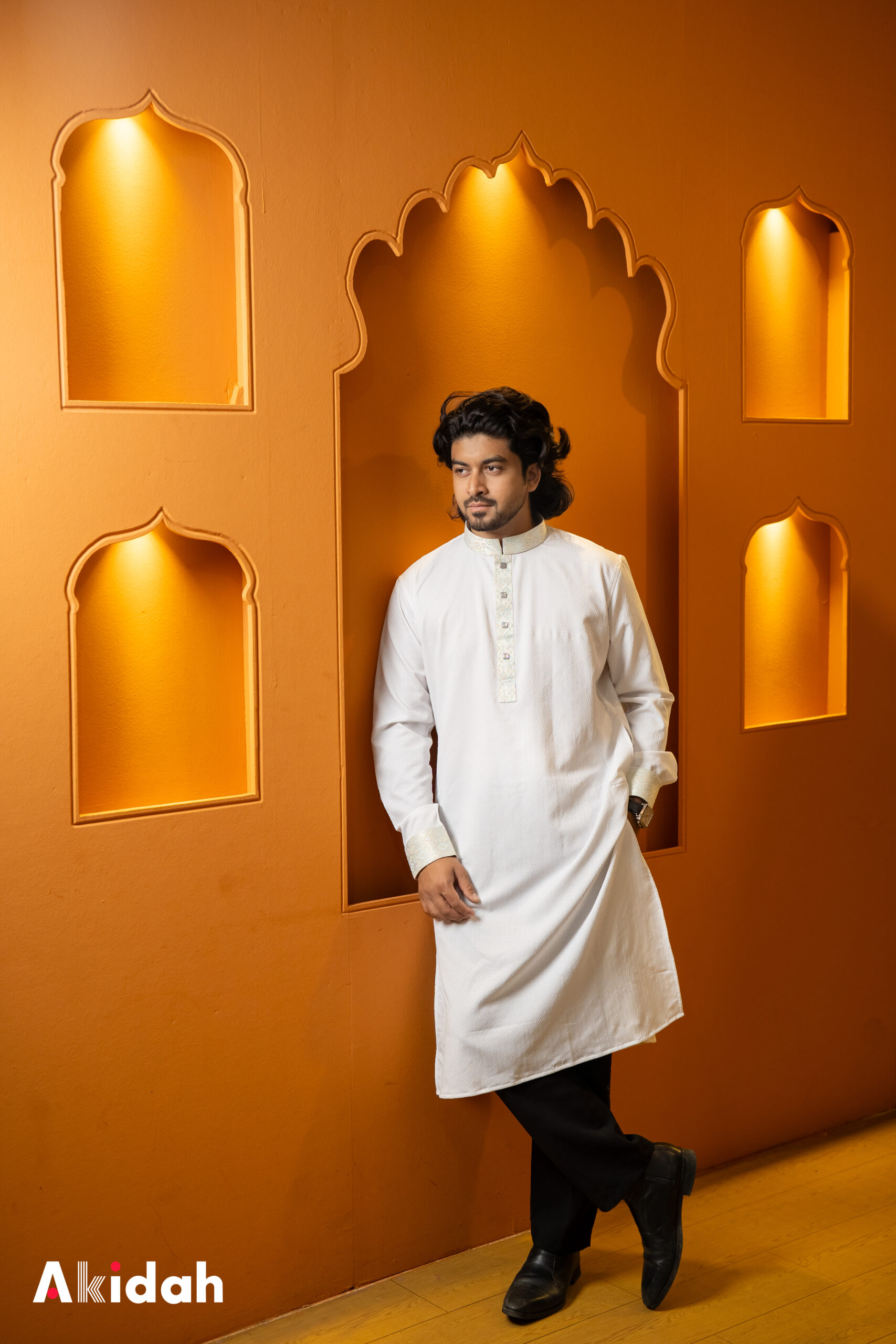An Arctic White Panjabi made from premium Chinese jacquard fabric, combining elegance, texture, and all-day comfort.