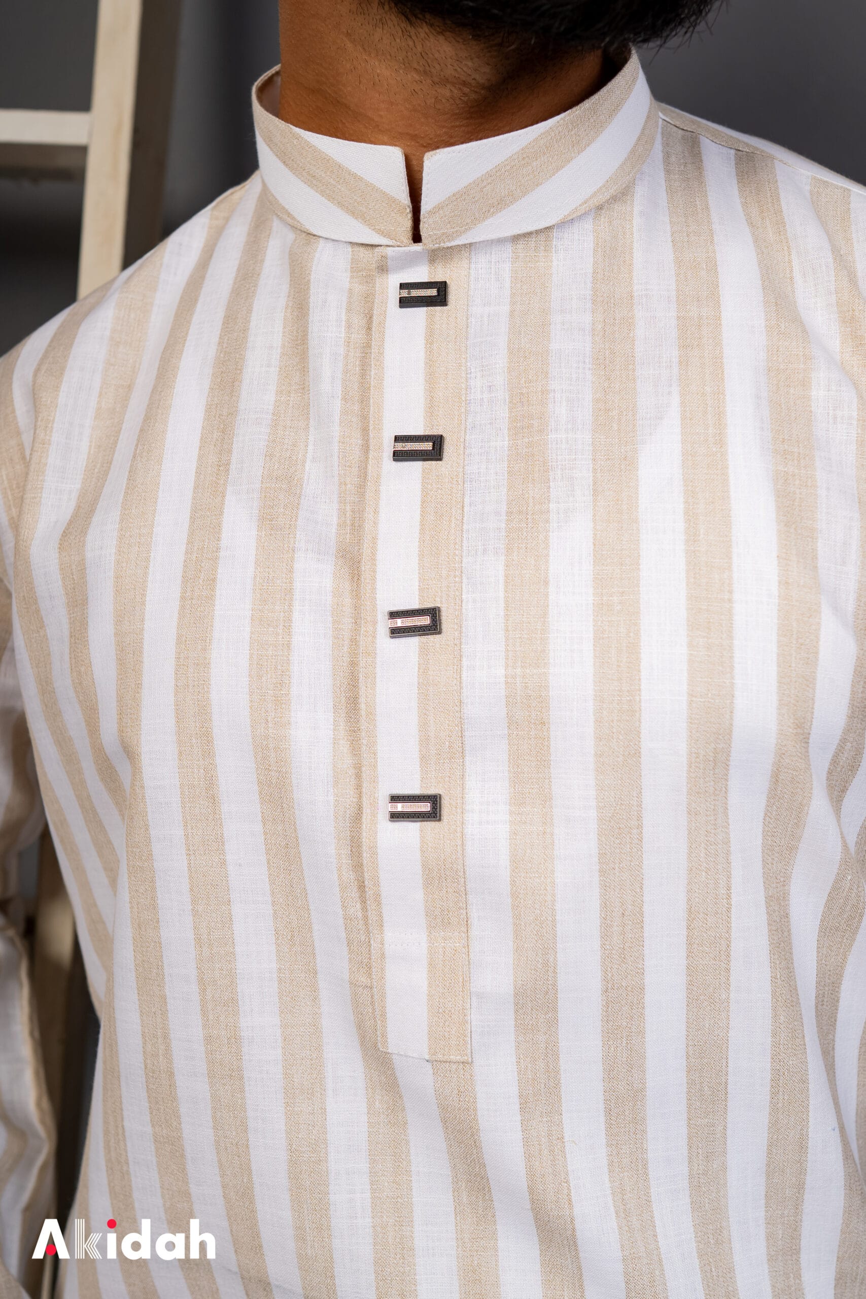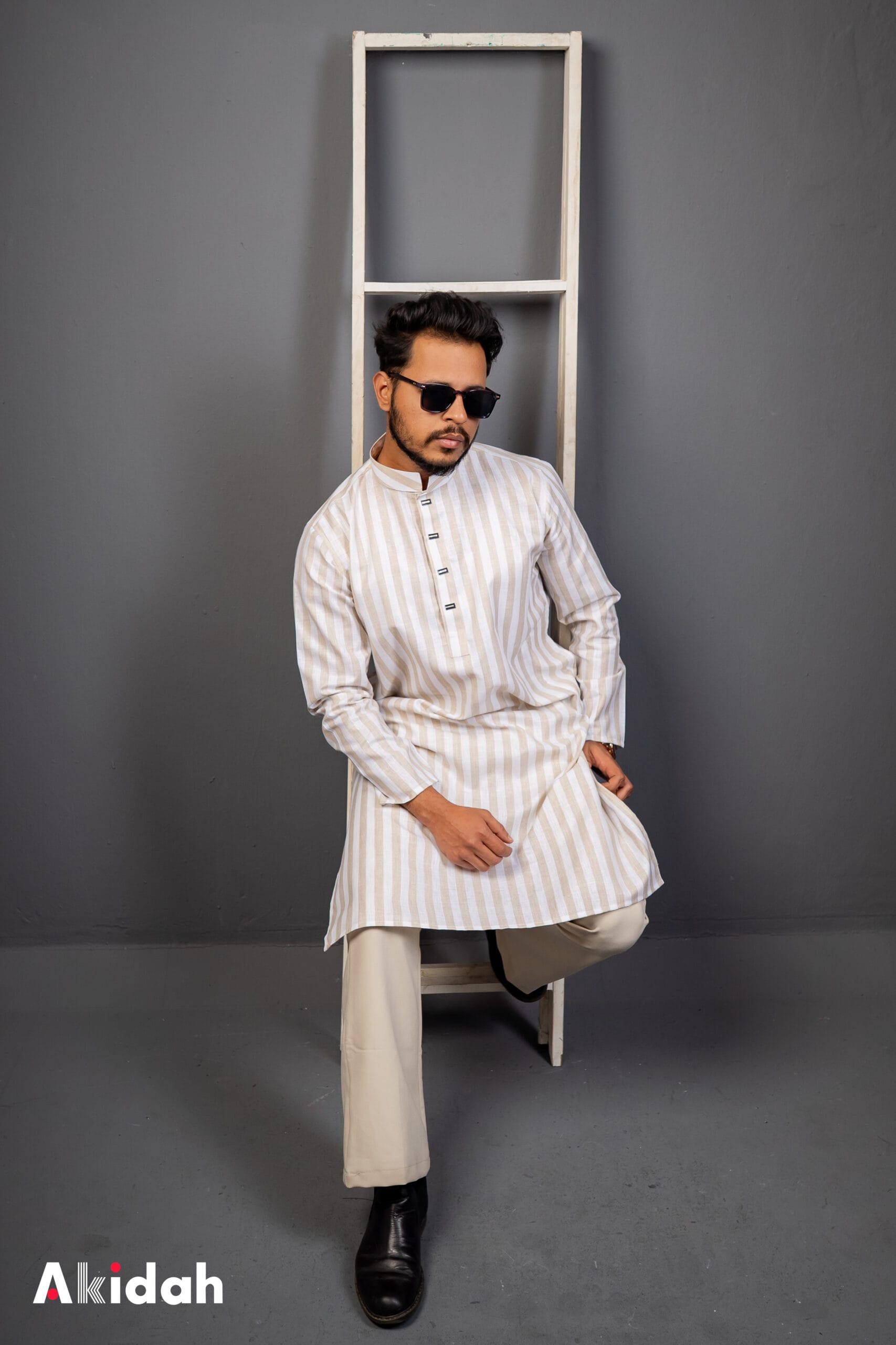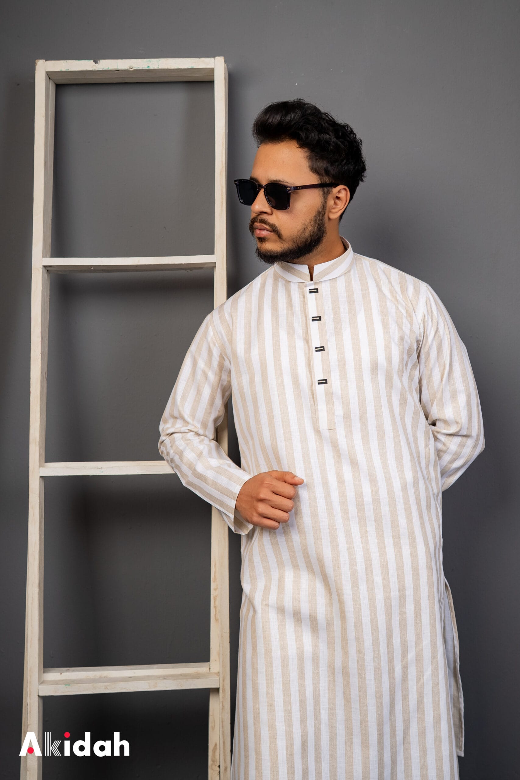 A Toasted Almond Panjabi made from 100% linen striped fabric, combining freshness, comfort, and effortless style.