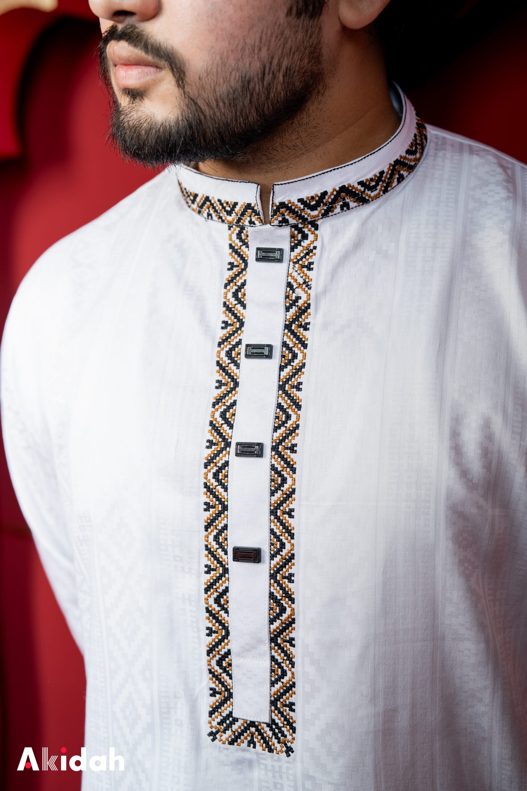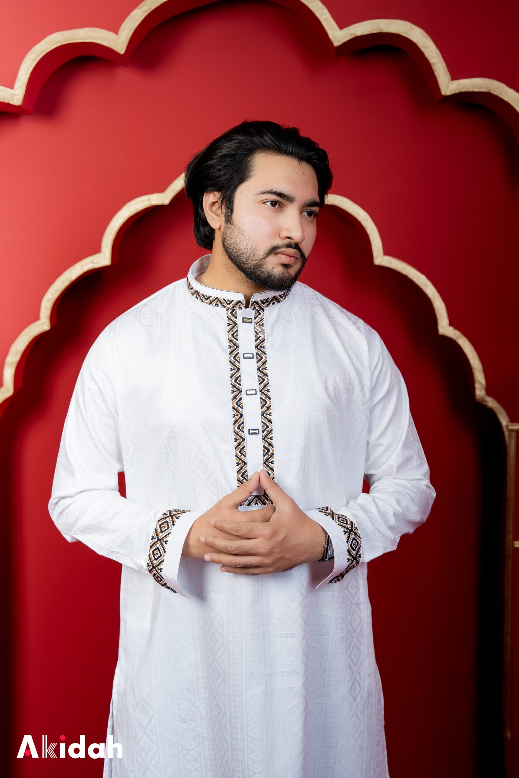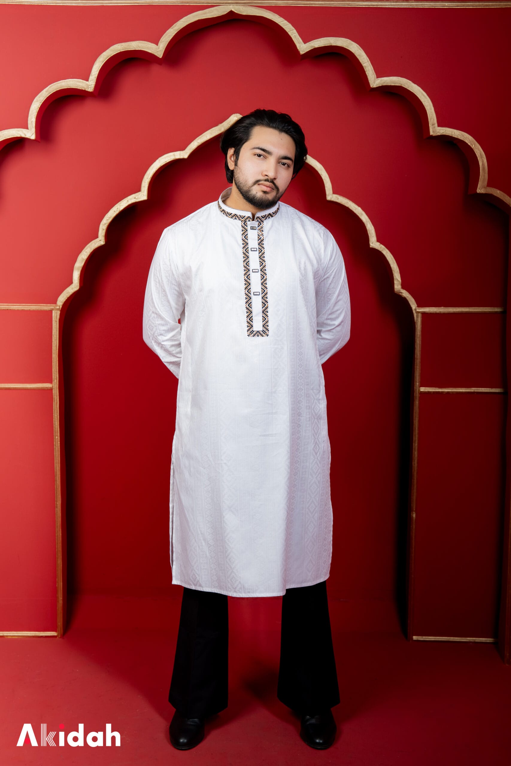 The Radiant Grid: Teal Azure Panjabi is crafted from a premium cotton and polyester blend, offering the perfect balance of comfort and durability. The elegant grid-inspired design adds subtle texture and depth, while the rich Teal Azure tone delivers a fresh yet sophisticated look. Designed for both special occasions and refined everyday wear, this piece blends modern style with timeless tradition.