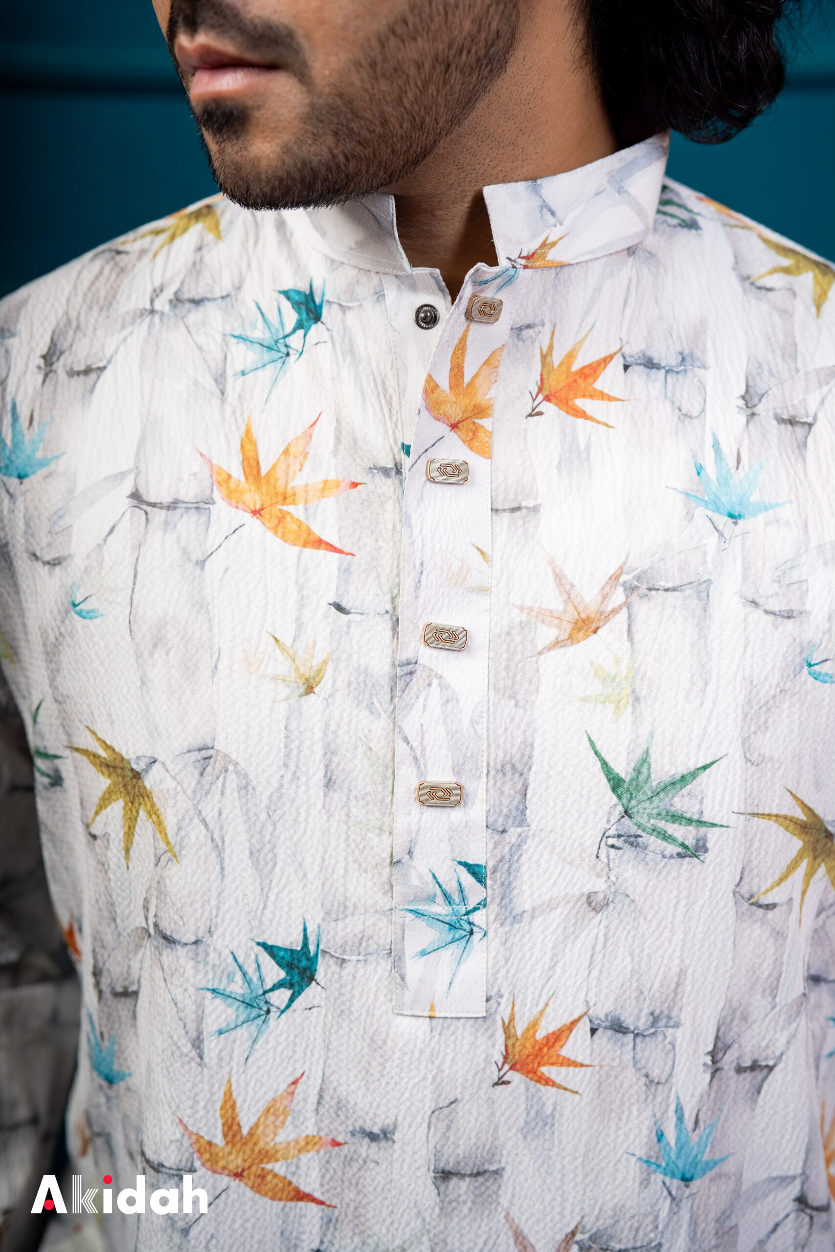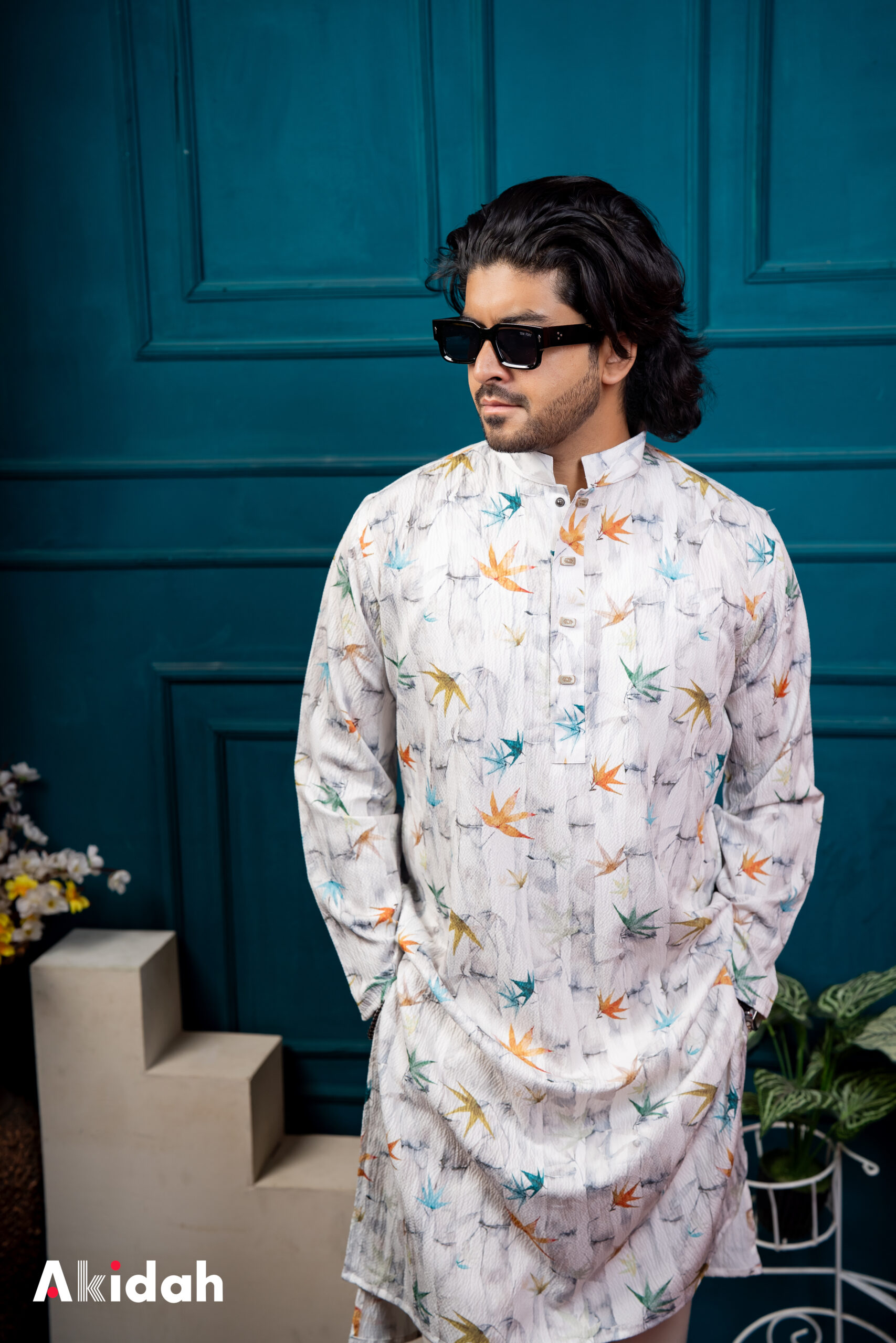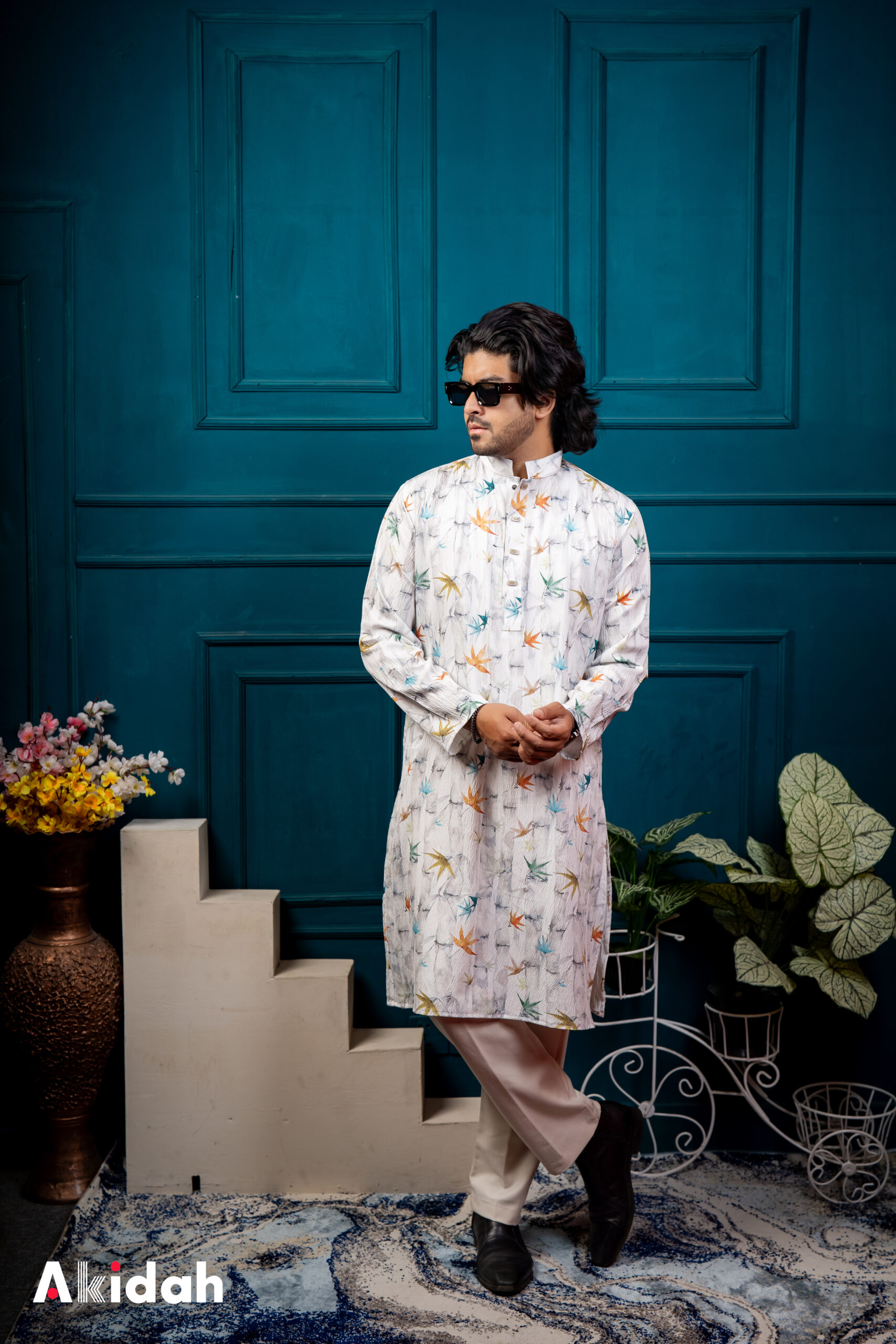 A Frosty White printed Panjabi with refined stitch-inspired detailing for a clean, elegant look.